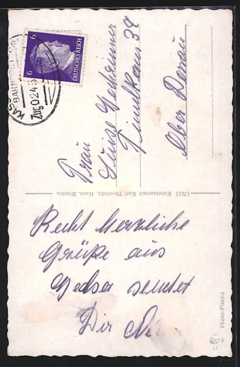 Personenbezogene Daten auf der Rückseite der Karte wurden durch blauen Textmarker unkenntlich gemacht. Die blauen Stellen sind auf die Vorderseite durchgeweicht und wirken sich negativ auf das Postkartenfoto aus