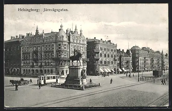AK Helsingborg, Järnvägsgatan, Denkmal mit Strassenbahn