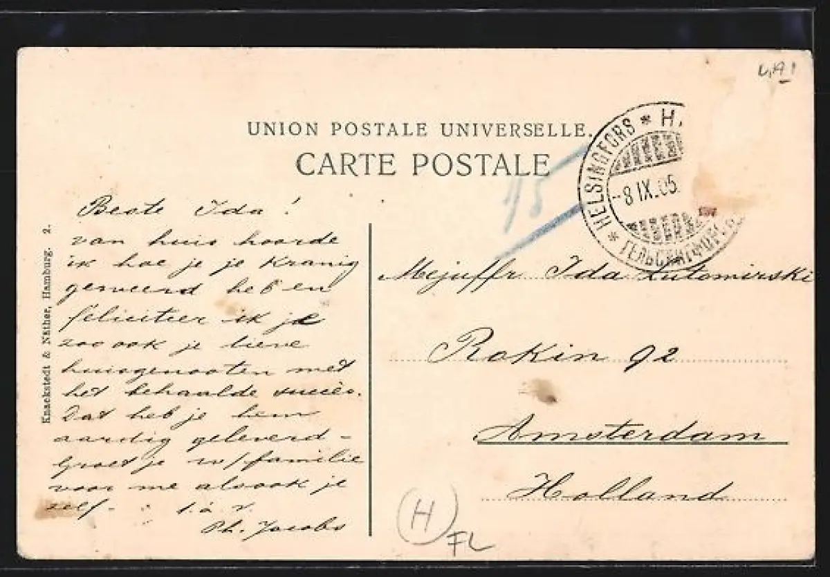 alte Ansichtskarte, gelaufen 1905, Briefmarke entfernt, rückseitig Oberflächenschaden, guter Zustand