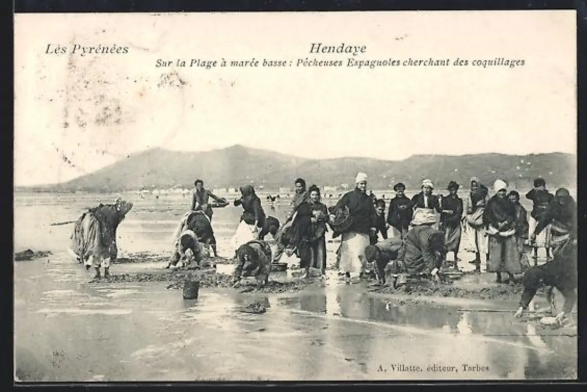 AK Hendaye /Les Pyrénées, Sur la plage à marée basse, Pêcheuses espagnoles cherchant des coquillages