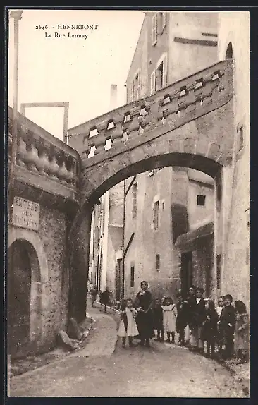 AK Hennebont, La Rue Lannay avec un groupe d`enfants sous l`arche en pierre