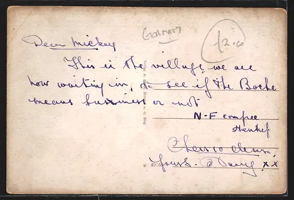 Personenbezogene Daten auf der Rückseite der Karte wurden durch blauen Textmarker unkenntlich gemacht. Die blauen Stellen sind auf die Vorderseite durchgeweicht und wirken sich negativ auf das Postkartenfoto aus