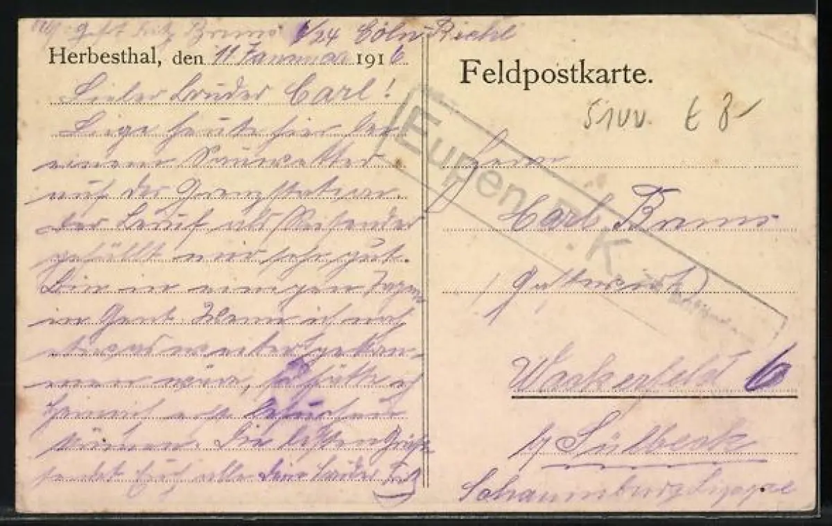 gelaufen 1916, Eckknick oben li., guter Zustand