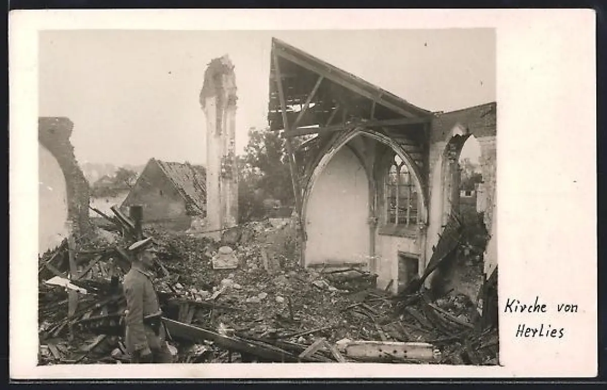 AK Herlies, Zerstörte Kirche mit Soldaten
