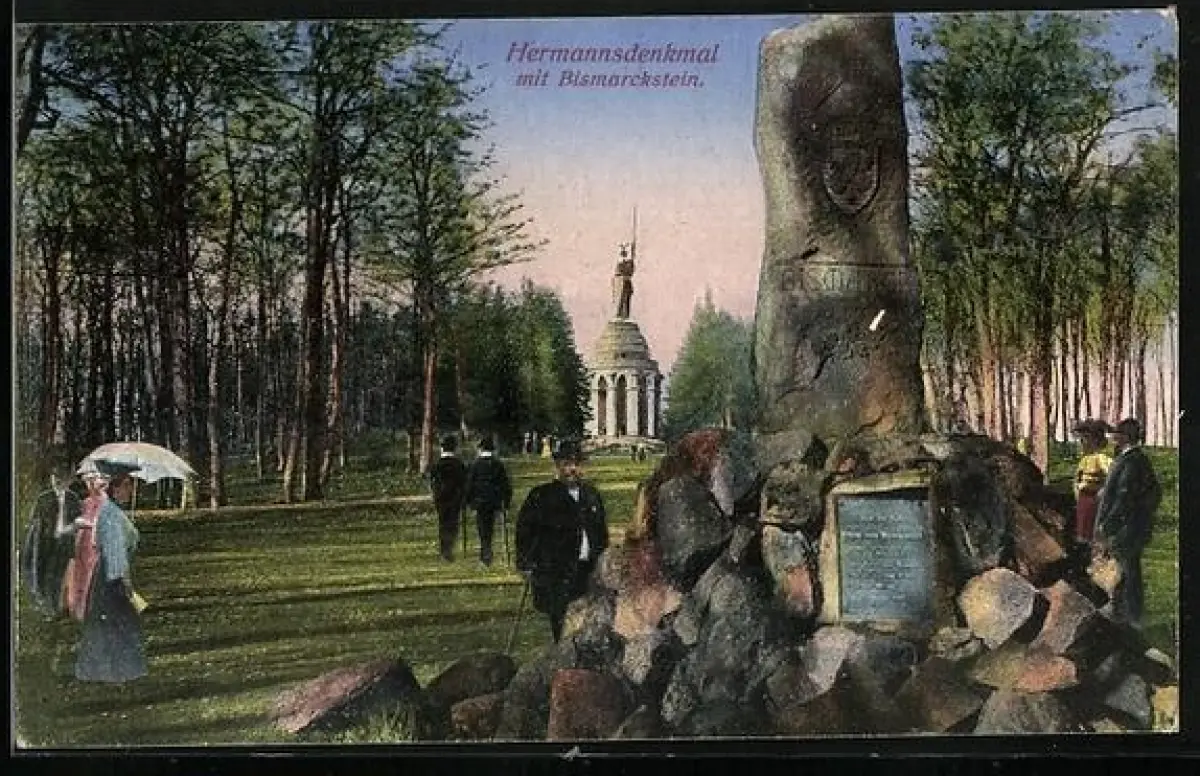 AK Hermannsdenkmal, Partie mit Besuchern am Bismarckstein