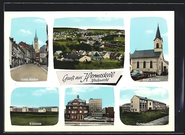 AK Hermeskeil, Kath. Kirche, Ev. Kirche, Kaserne, Gymnasium, Krankenhaus und Ortsansicht
