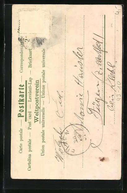 alte Ansichtskarte, gelaufen, Briefmarke entfernt, rückseitig Oberflächenschaden, Bugspur re. oben, Stempelspur, guter Zustand