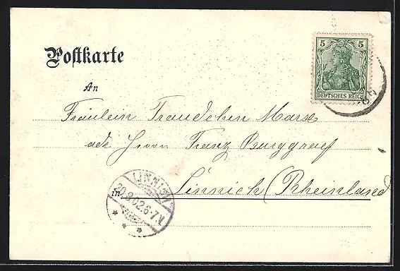 gelaufen 1902, Eckknick oben li., guter Zustand