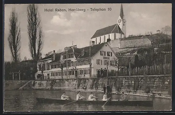 AK Herrliberg, Hotel Raben u. Riemenvierer mit Ruderboot