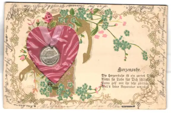 AK Herzensuhr, Münze mit eingeprägter Uhr in herzförmigem Ausschnitt, lithographisches Passepartout