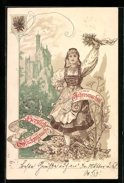 AK Herzliche Glückwünsche zum Jahreswechsel, Mädchen im Trachtenkleid vor Burg