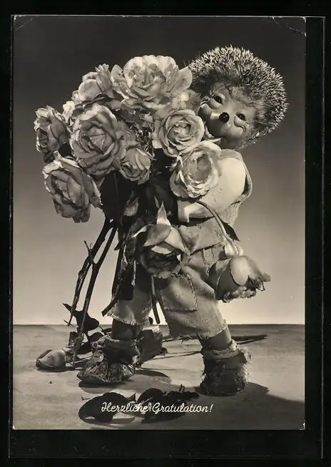 AK Herzliche Gratulation ! - Mecki mit einem Strauss Rosen