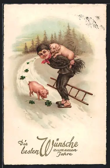 AK Herzliche Neujahrsgrüsse, kleiner Schornsteinfeger mit Ferkeln