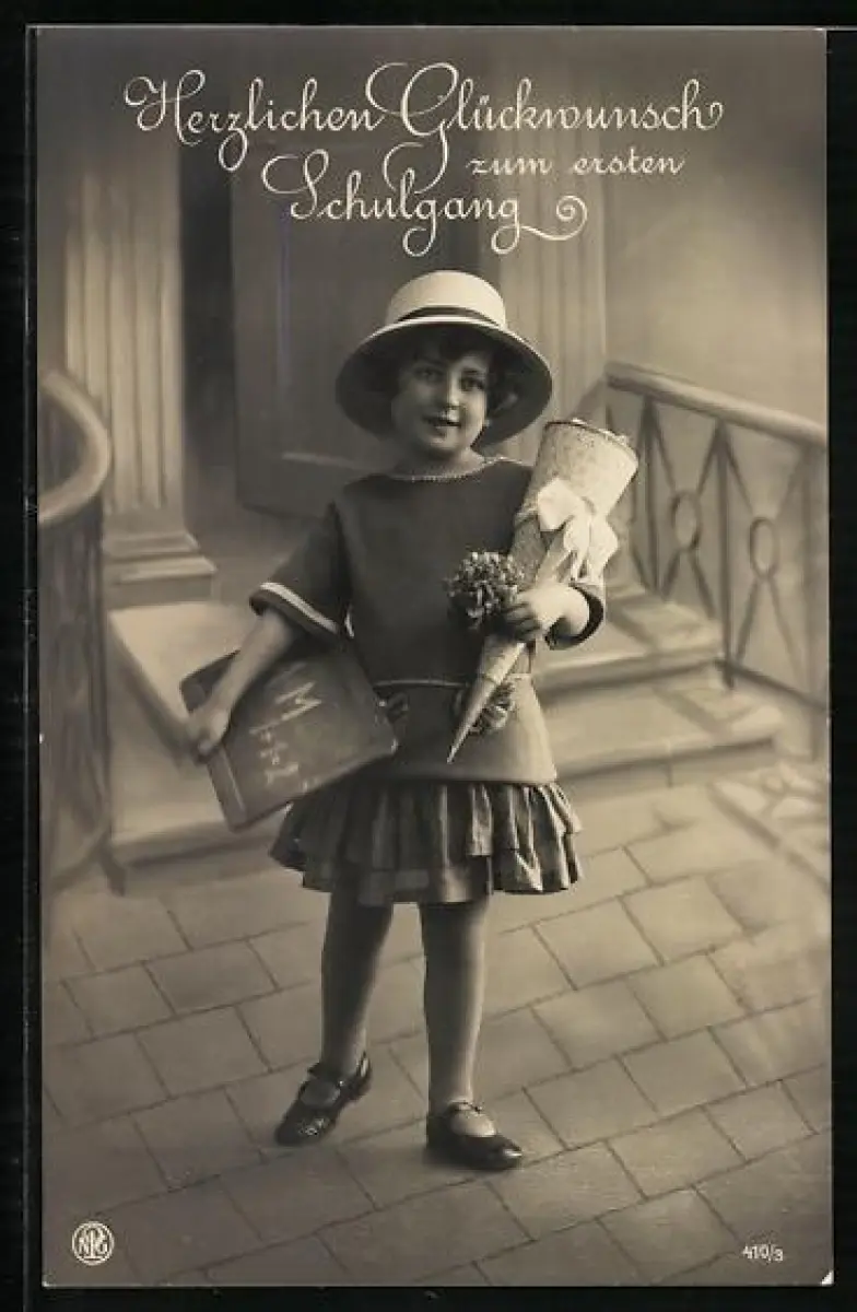 AK Herzlichen Glückwunsch zum ersten Schulgang, Mädchen mit Hut, Schiefertafel und Zuckertüte