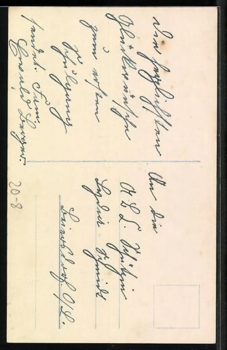 Personenbezogene Daten auf der Rückseite der Karte wurden durch blauen Textmarker unkenntlich gemacht. Die blauen Stellen sind auf die Vorderseite durchgeweicht und wirken sich negativ auf das Postkartenfoto aus