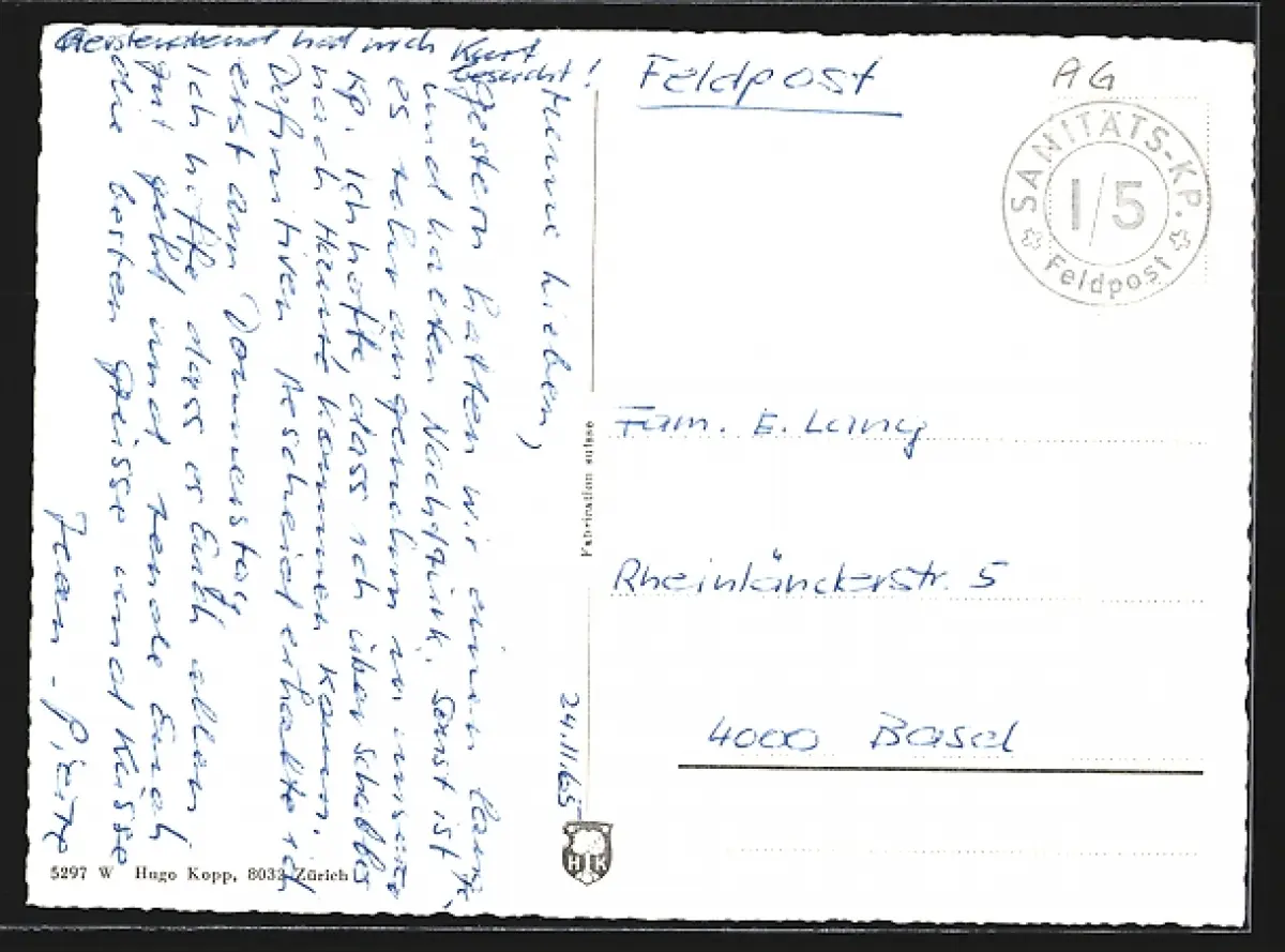 gelaufen 1965 als Feldpost, Eckknick links oben, guter Zustand