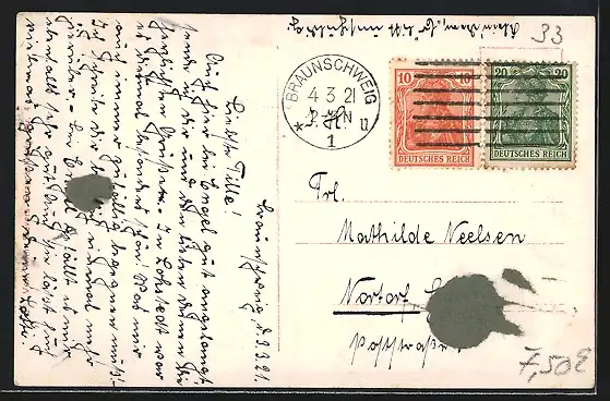 gelaufen 1921, rückseitig Klebe- und Papierreste, guter Zustand