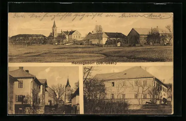 AK Herzogsdorf, Ortspartie mit Kirche, Gebäudeansicht, Brunnen
