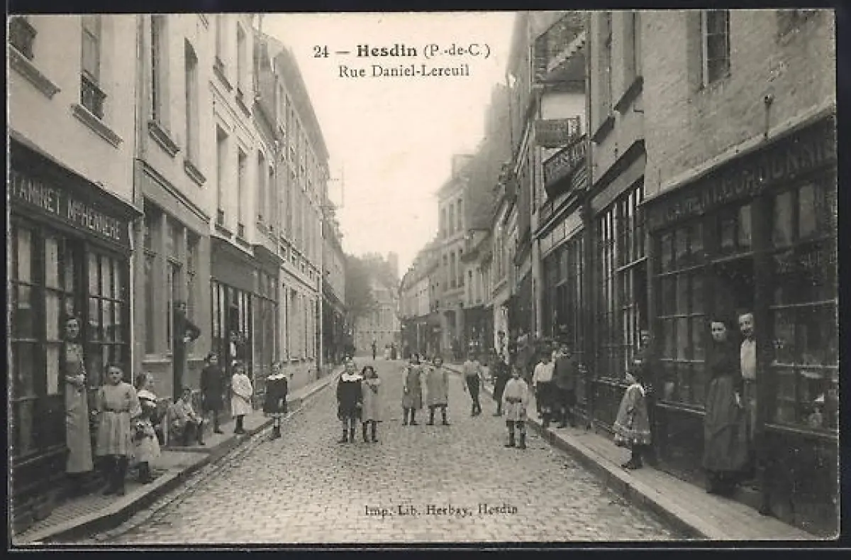 AK Hesdin /P.-de-C., Rue Daniel-Lereuil avec enfants et commerces