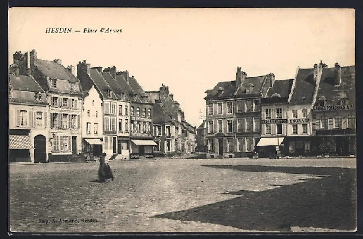 AK Hesdin, Place d`Armes avec bâtiments historiques et passante