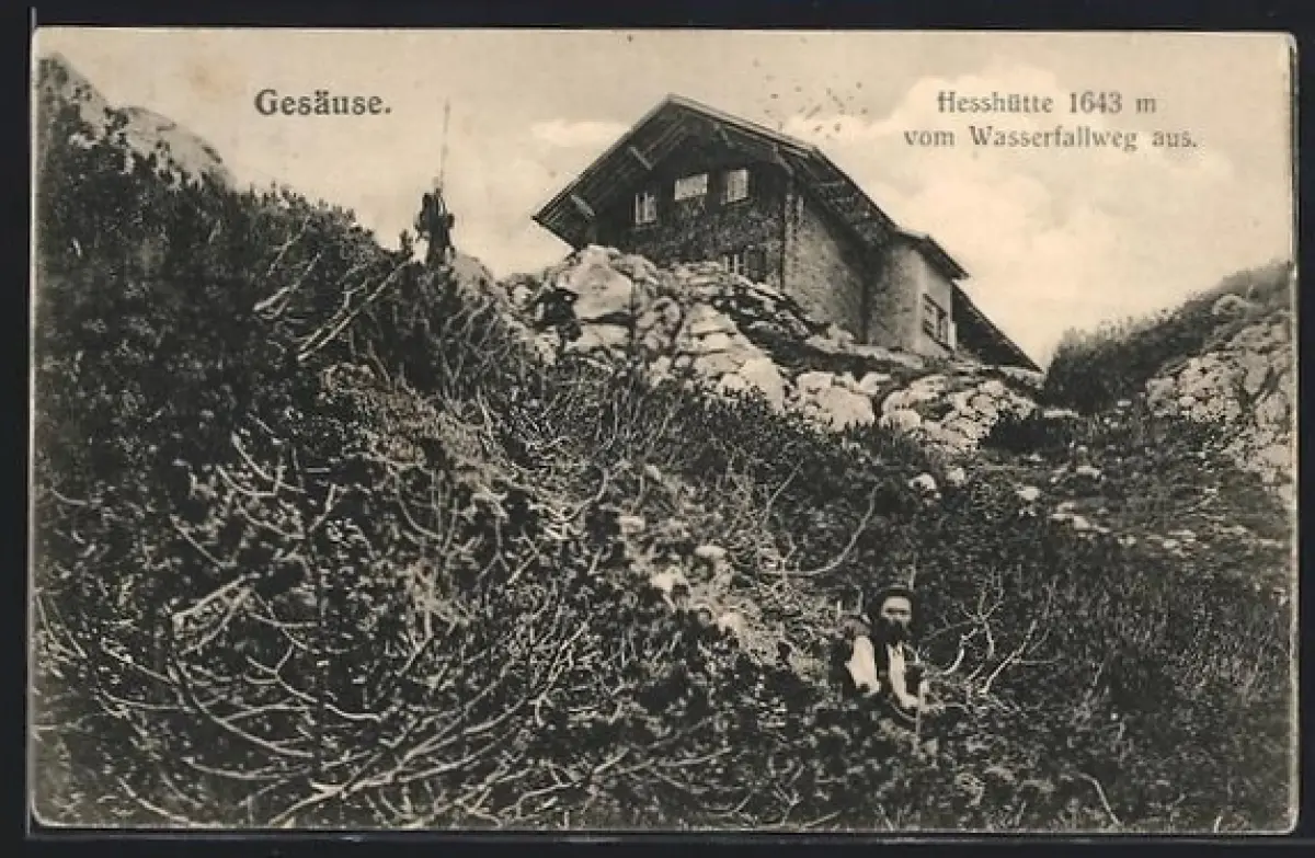 AK Hesshütte, Blick vom Wasserfallweg auf die Hütte