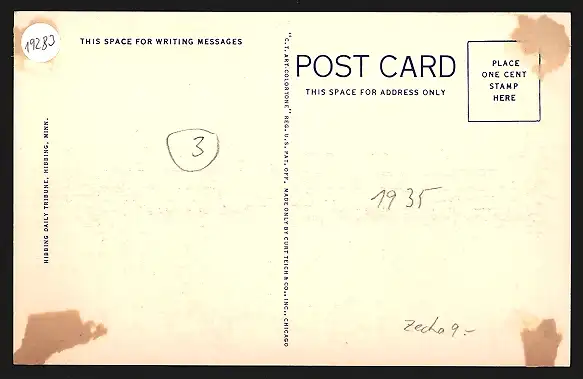 Personenbezogene Daten auf der Rückseite der Karte wurden durch blauen Textmarker unkenntlich gemacht. Die blauen Stellen sind auf die Vorderseite durchgeweicht und wirken sich negativ auf das Postkartenfoto aus