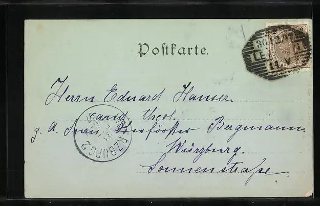 Personenbezogene Daten auf der Rückseite der Karte wurden durch blauen Textmarker unkenntlich gemacht. Die blauen Stellen sind auf die Vorderseite durchgeweicht und wirken sich negativ auf das Postkartenfoto aus