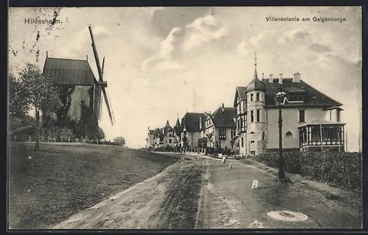 AK Hildesheim, Strasse zur Villenkolonie am Galgenberge mit Windmühle