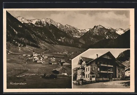 AK Hinterstein, Gasthof zum Steinadler, Ortspanorama mit Gebirge