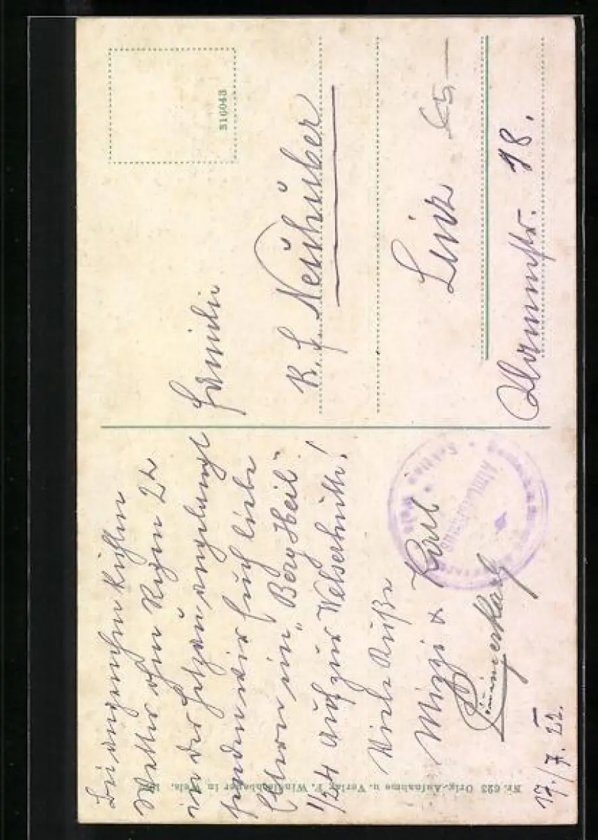 Personenbezogene Daten auf der Rückseite der Karte wurden durch blauen Textmarker unkenntlich gemacht. Die blauen Stellen sind auf die Vorderseite durchgeweicht und wirken sich negativ auf das Postkartenfoto aus