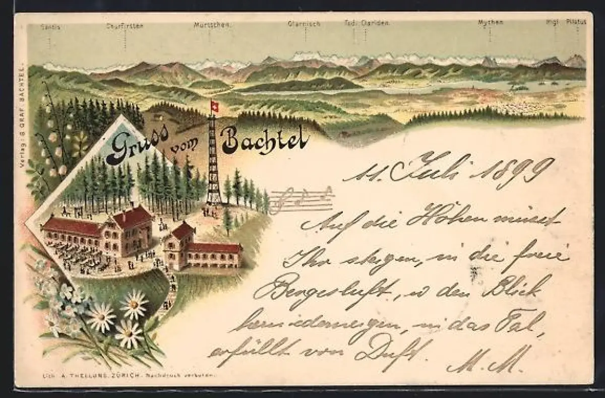 AK Hinweil, Gasthof Bachtel mit Bergpanorama
