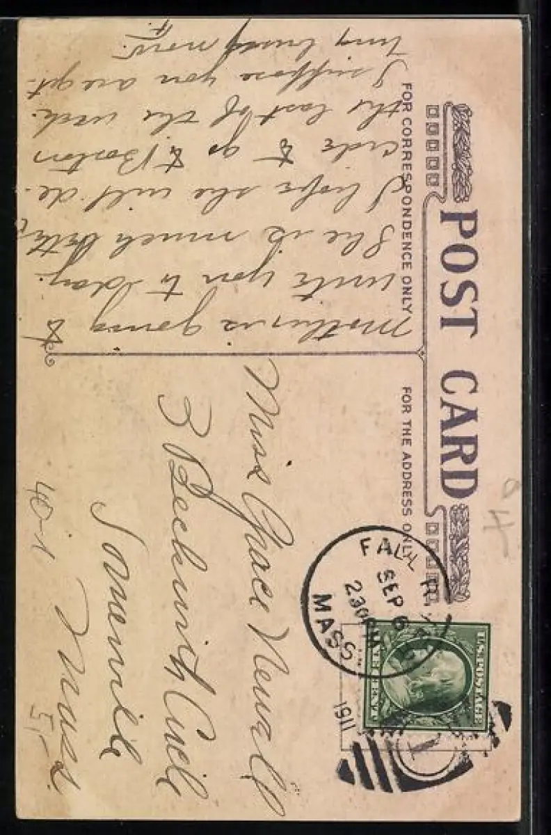 Personenbezogene Daten auf der Rückseite der Karte wurden durch blauen Textmarker unkenntlich gemacht. Die blauen Stellen sind auf die Vorderseite durchgeweicht und wirken sich negativ auf das Postkartenfoto aus