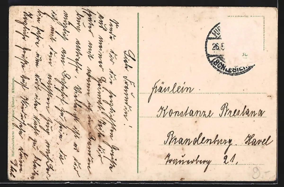 Personenbezogene Daten auf der Rückseite der Karte wurden durch blauen Textmarker unkenntlich gemacht. Die blauen Stellen sind auf die Vorderseite durchgeweicht und wirken sich negativ auf das Postkartenfoto aus