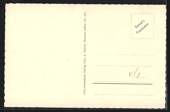 Personenbezogene Daten auf der Rückseite der Karte wurden durch blauen Textmarker unkenntlich gemacht. Die blauen Stellen sind auf die Vorderseite durchgeweicht und wirken sich negativ auf das Postkartenfoto aus