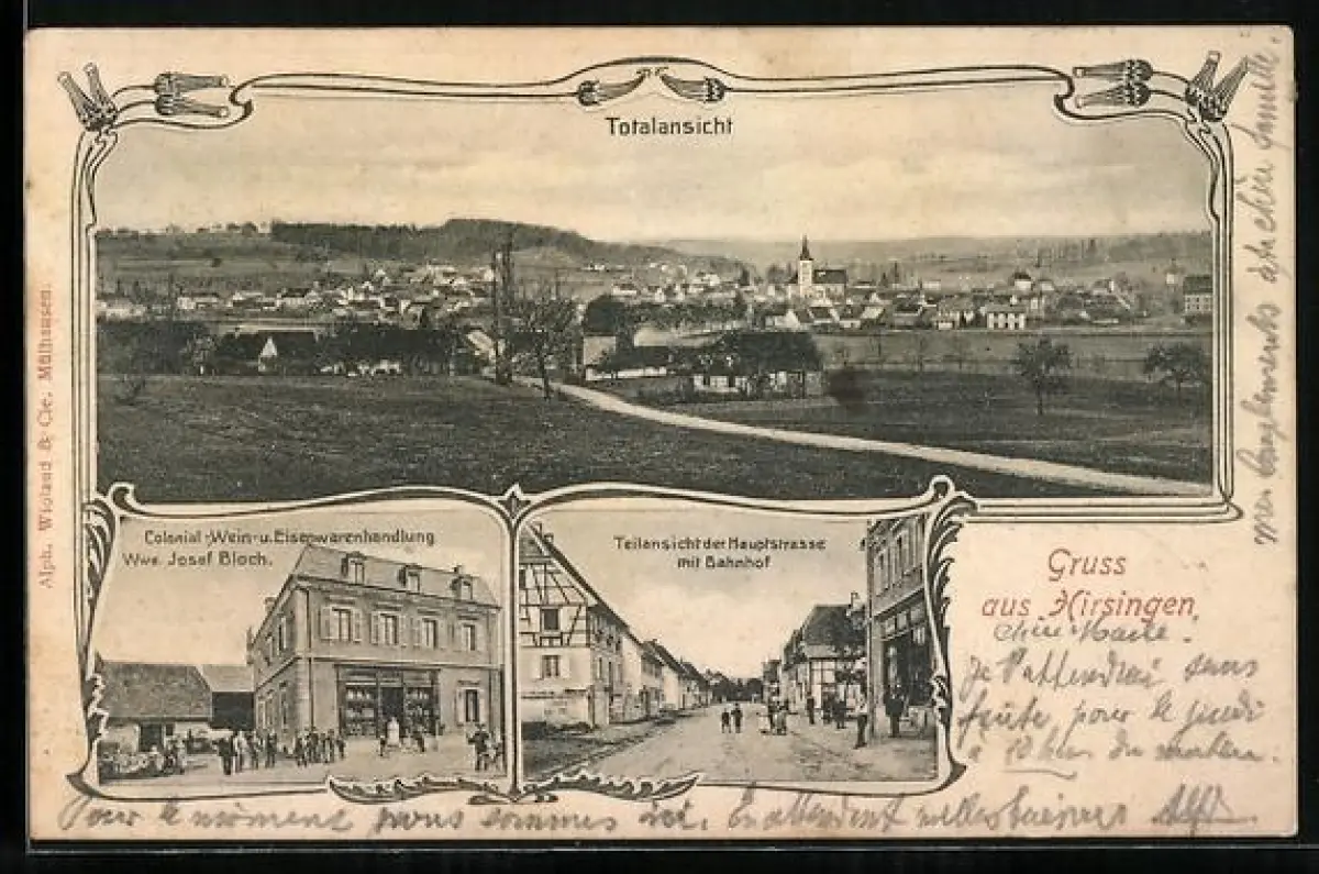 AK Hirsingen, Teilansicht der Hauptstrasse mit Bahnhof, Kolonial- und Weinhandlung Wwe. Josef Bloch, Totalansicht