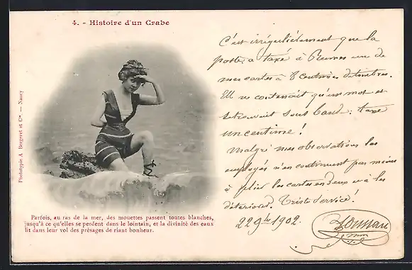 AK Histoire d`un Grabe, Frau auf einem Felsen im Badeanzug