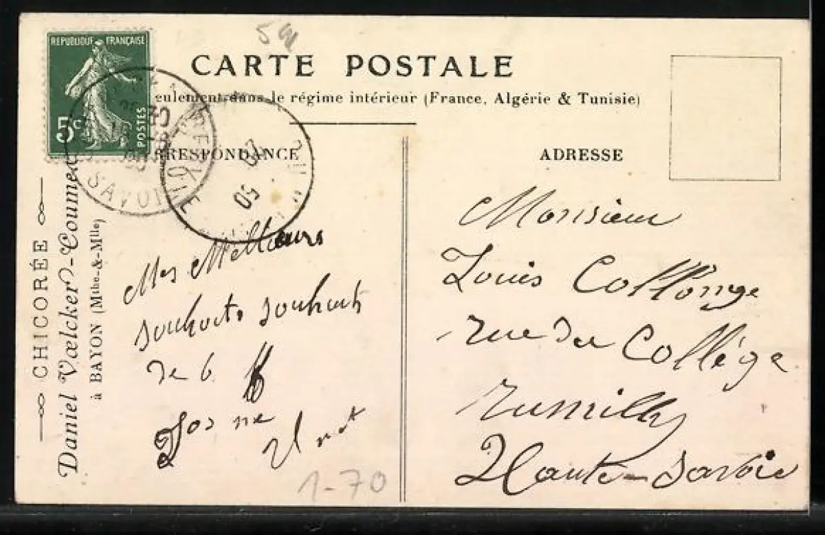 Personenbezogene Daten auf der Rückseite der Karte wurden durch blauen Textmarker unkenntlich gemacht. Die blauen Stellen sind auf die Vorderseite durchgeweicht und wirken sich negativ auf das Postkartenfoto aus