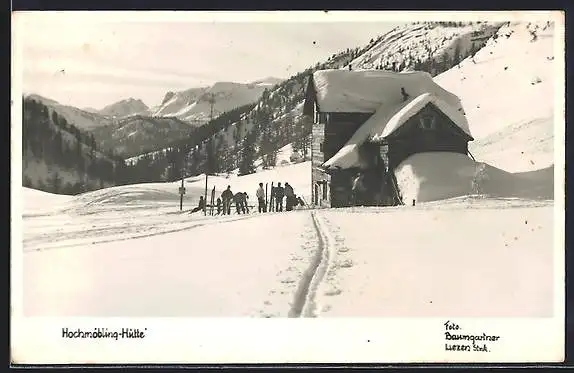 AK Hochmöbling-Hütte, Ansicht mit Gipfelpanorama und Skiläufern im Winter