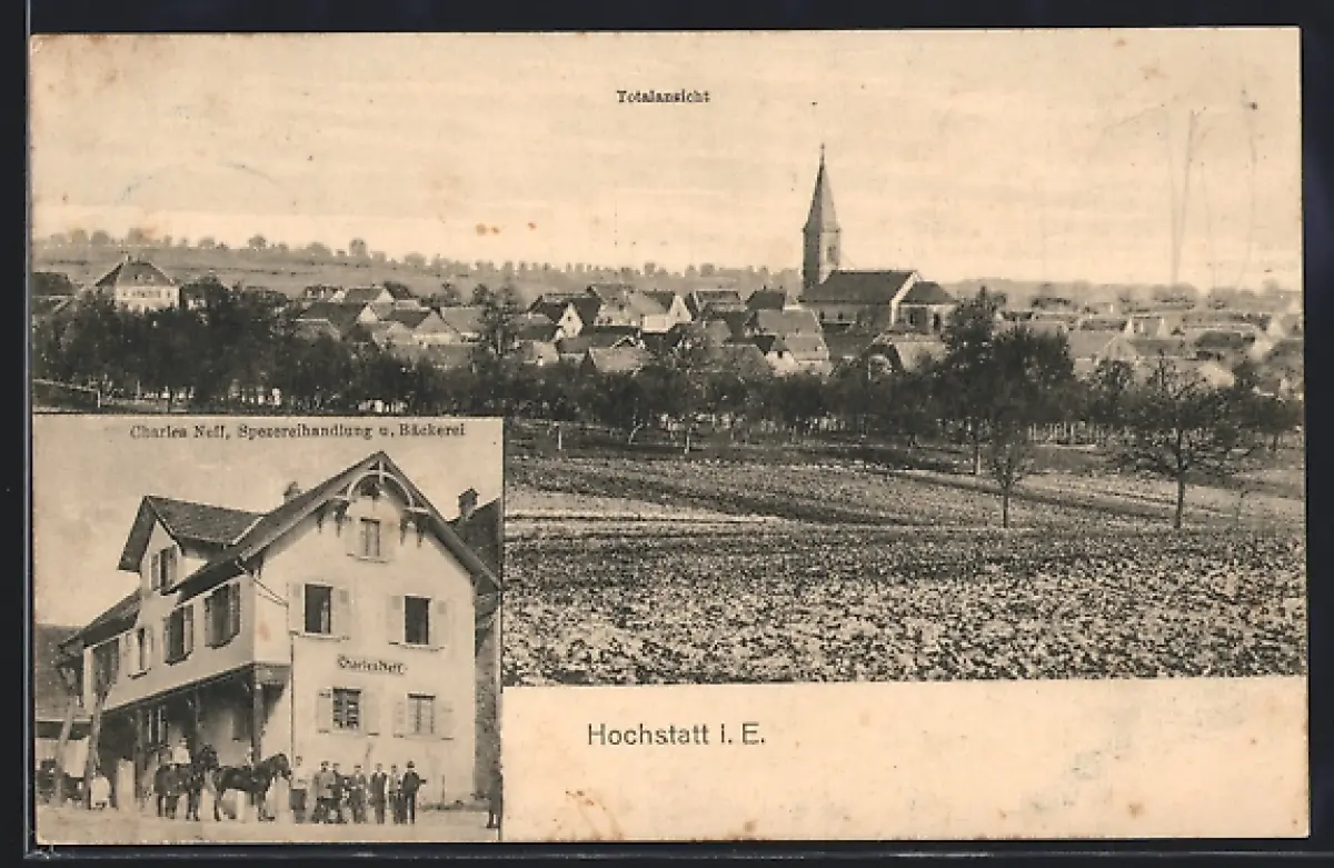 AK Hochstatt i. E., Geschäft von Charles Neff, Totalansicht