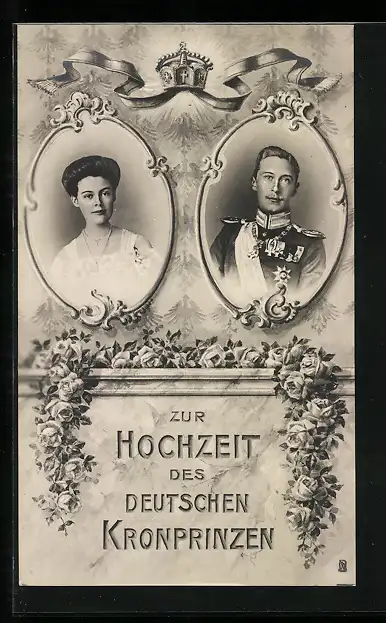 AK Hochzeit, Krone, Rosen, Kronprinz Wilhelm von Preussen mit Kronprinzessin Cecilie