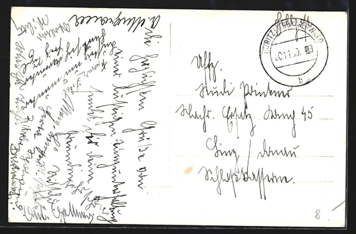 Personenbezogene Daten auf der Rückseite der Karte wurden durch blauen Textmarker unkenntlich gemacht. Die blauen Stellen sind auf die Vorderseite durchgeweicht und wirken sich negativ auf das Postkartenfoto aus