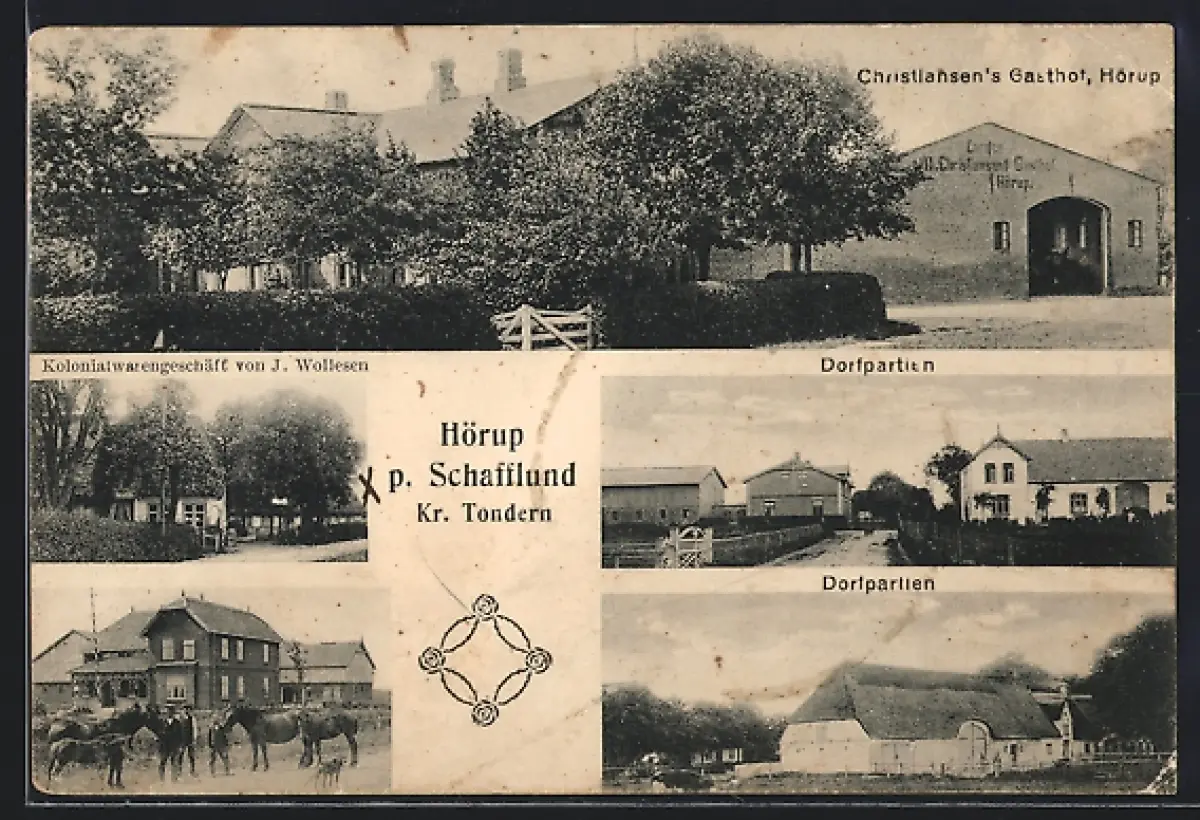 AK Hörup p. Schafflund /Krs. Tondern, Christiansen`s Gasthof, Kolonialwarengeschäft von J. Wollesen, Dorfpartien