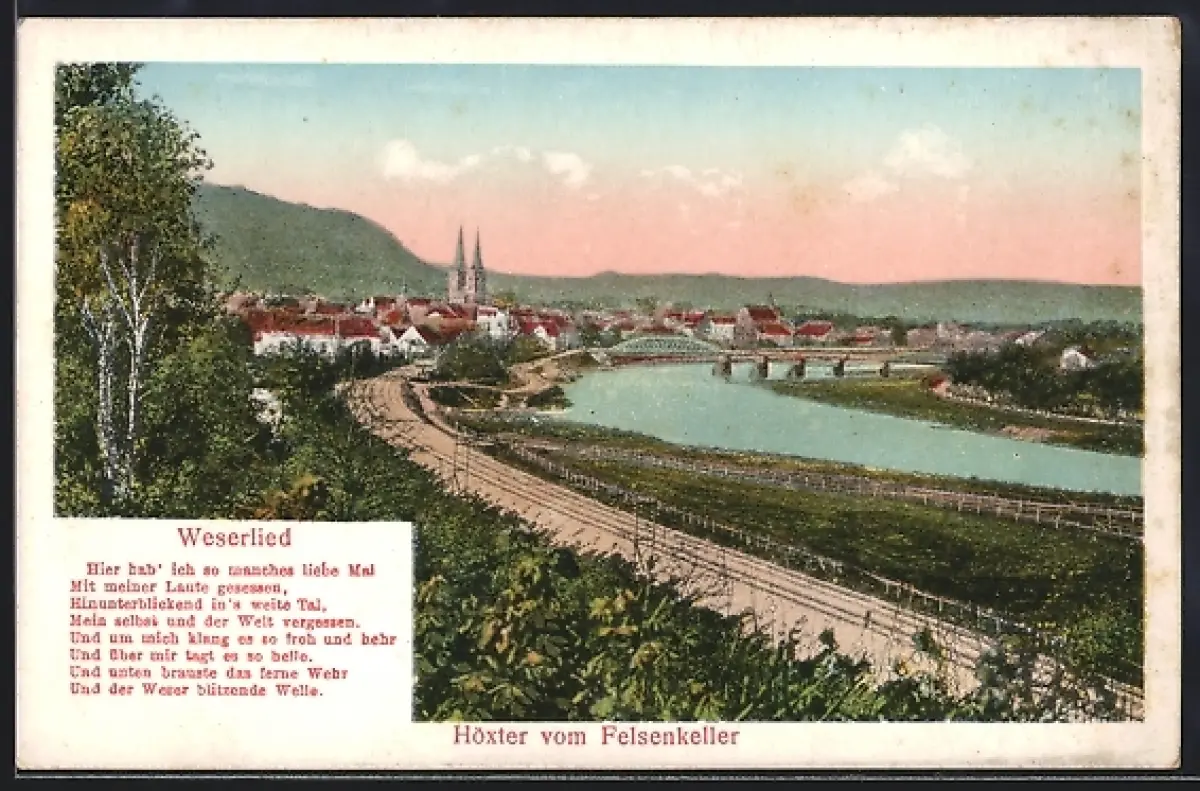 AK Höxter, Blick vom Felsenkeller auf Stadt, Weser und Brücke
