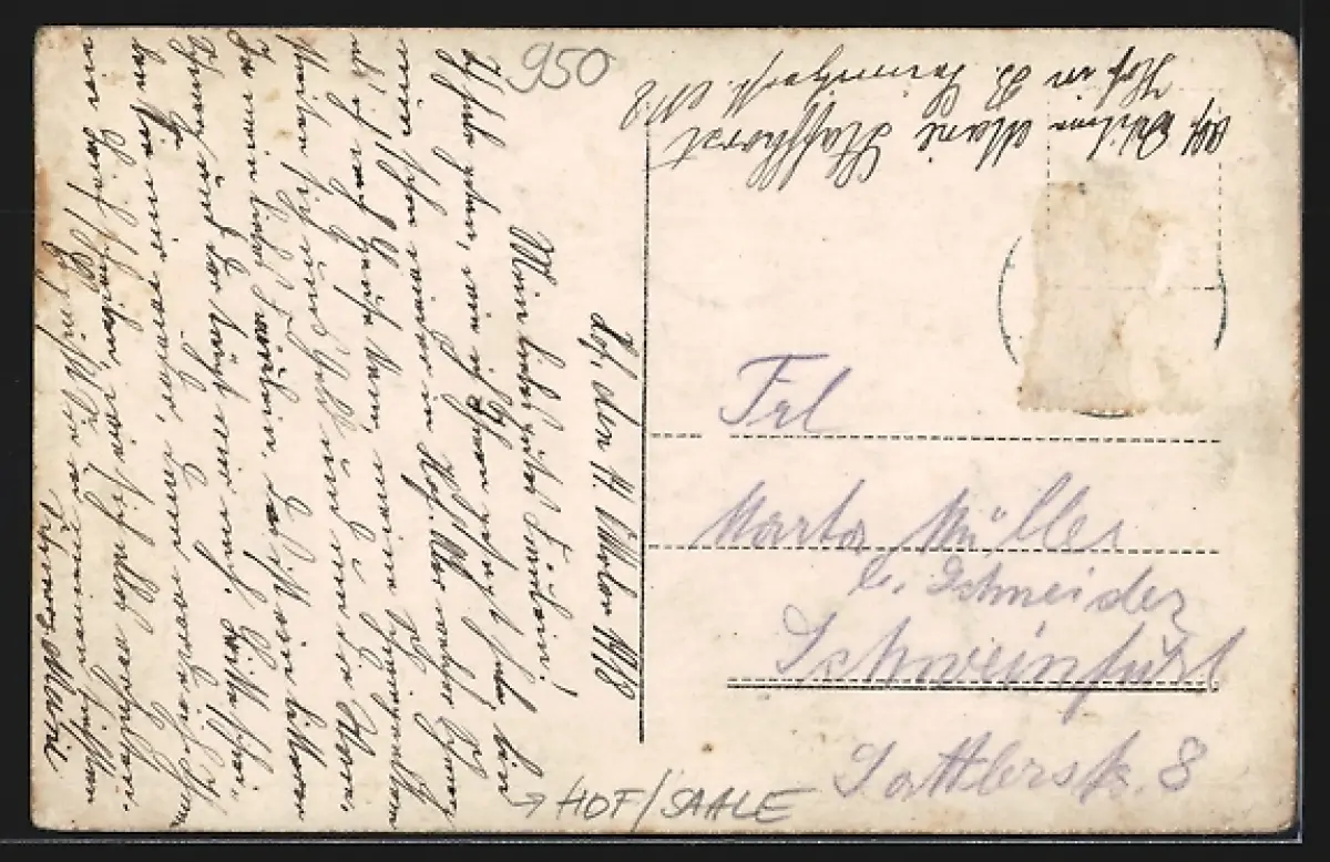 Personenbezogene Daten auf der Rückseite der Karte wurden durch blauen Textmarker unkenntlich gemacht. Die blauen Stellen sind auf die Vorderseite durchgeweicht und wirken sich negativ auf das Postkartenfoto aus