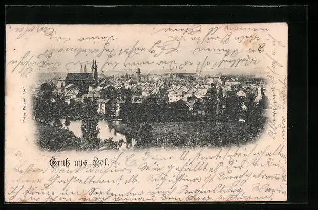AK Hof, Totalansicht mit Fluss aus der Vogelschau