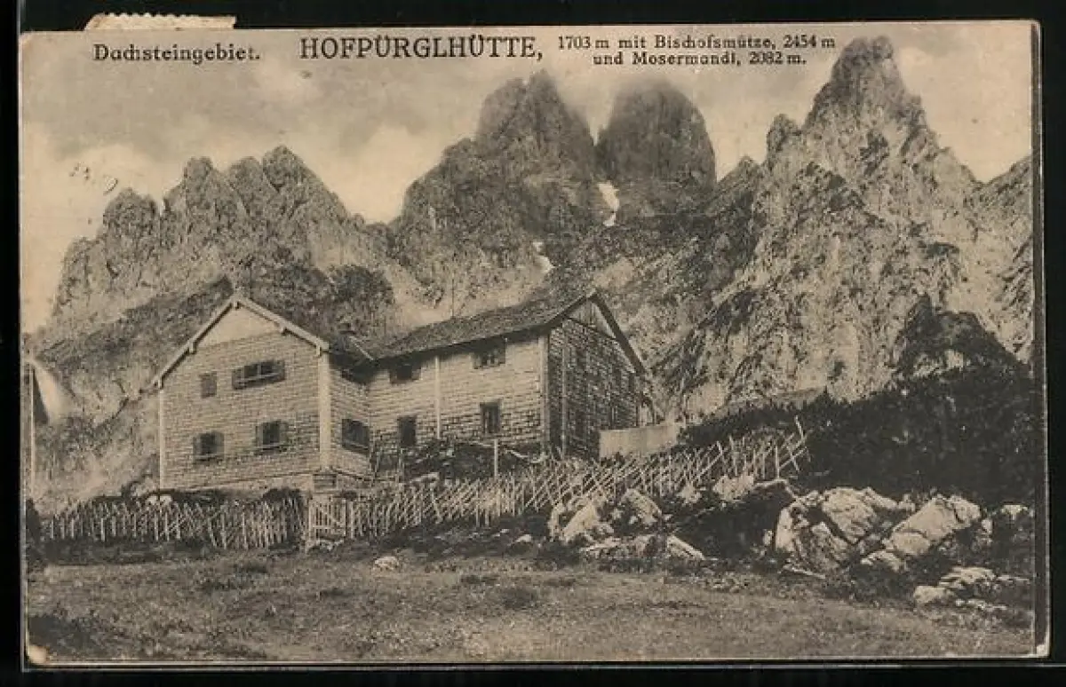 AK Hofpürglhütte, Berghütte mit Bischofsmütze und Mosermandl