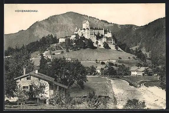AK Hohenaschau, Panorama des Ortes mit Bergen