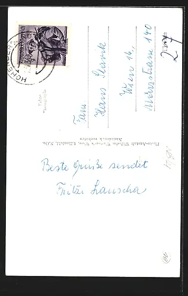 Personenbezogene Daten auf der Rückseite der Karte wurden durch blauen Textmarker unkenntlich gemacht. Die blauen Stellen sind auf die Vorderseite durchgeweicht und wirken sich negativ auf das Postkartenfoto aus