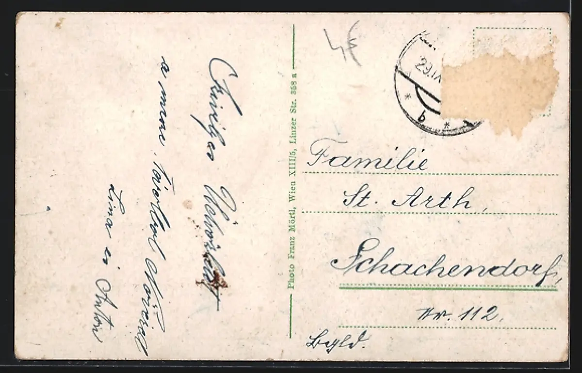 alte Ansichtskarte, gelaufen, Briefmarke entfernt, rückseitig Oberflächenschaden, guter Zustand