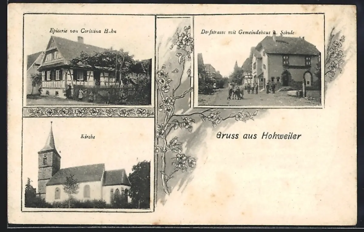 AK Hohweiler, Épicerie von Christina Hahn, Dorfstrasse mit Gemeindehaus und Schule